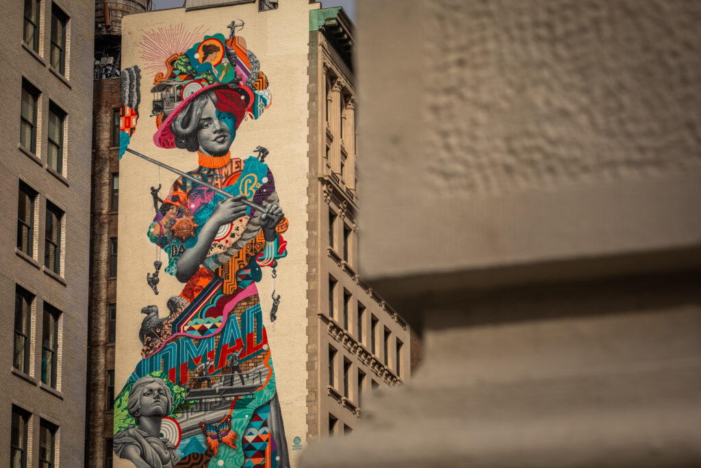 New York City, USA – 12 February 2022: Mural “The Gilded Lady” by Tristan Eaton on a Facade on 5th Avenue; Copy Space